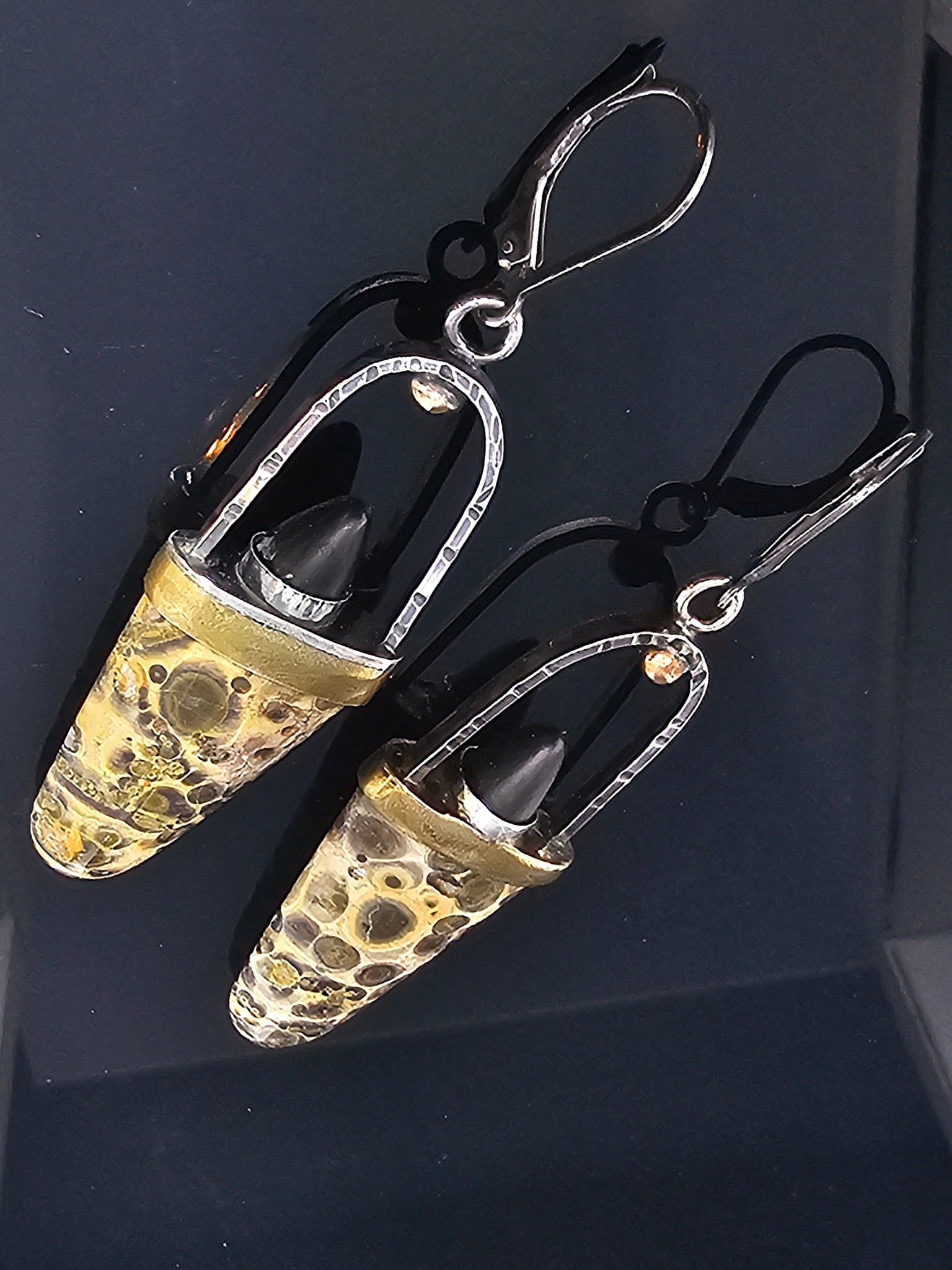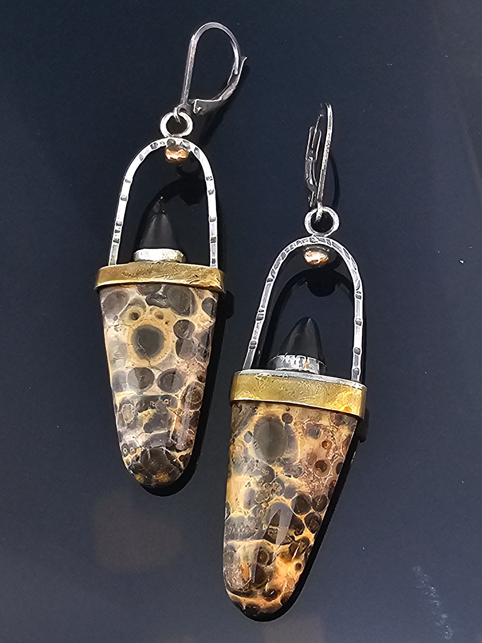 Tounge shaped leopard skin jasper stones set in sterling silver and brass. A bullet shaped onyx sits on top. Leverback earwires. 2" long x 3/4" wide approx. Antiqued finish. Original design of Alejandra Whittier/Stone Disegno by Ale©