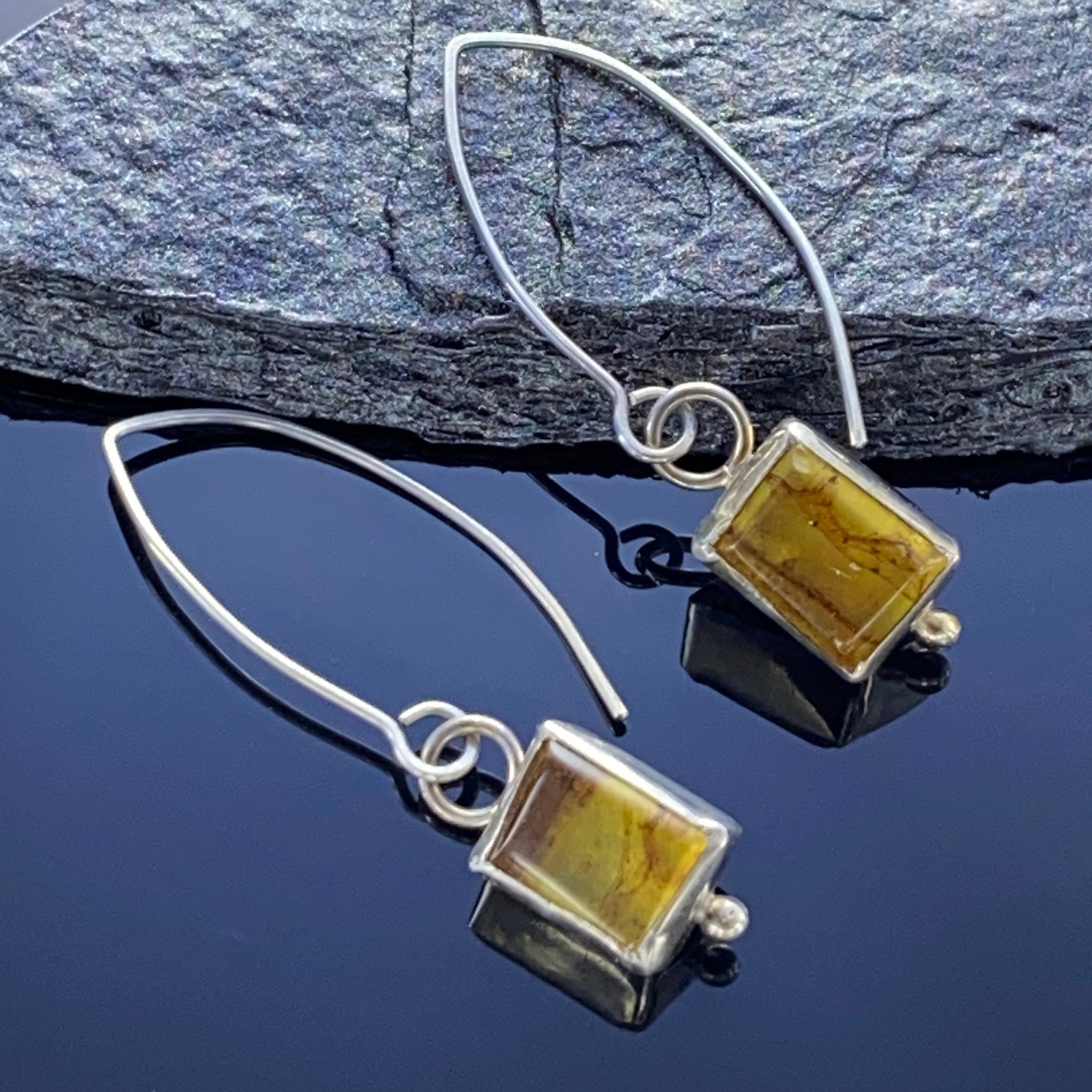 Beautiful rectangular amber cabochons, with red/brown lines that goes through the golden amber. From the Simojovel mine in Chiapas, Mexico. Set in a dangling earring with handmade sterling silver earwires. Original design of Alejandra Whittier/Stone Disegno by Ale©