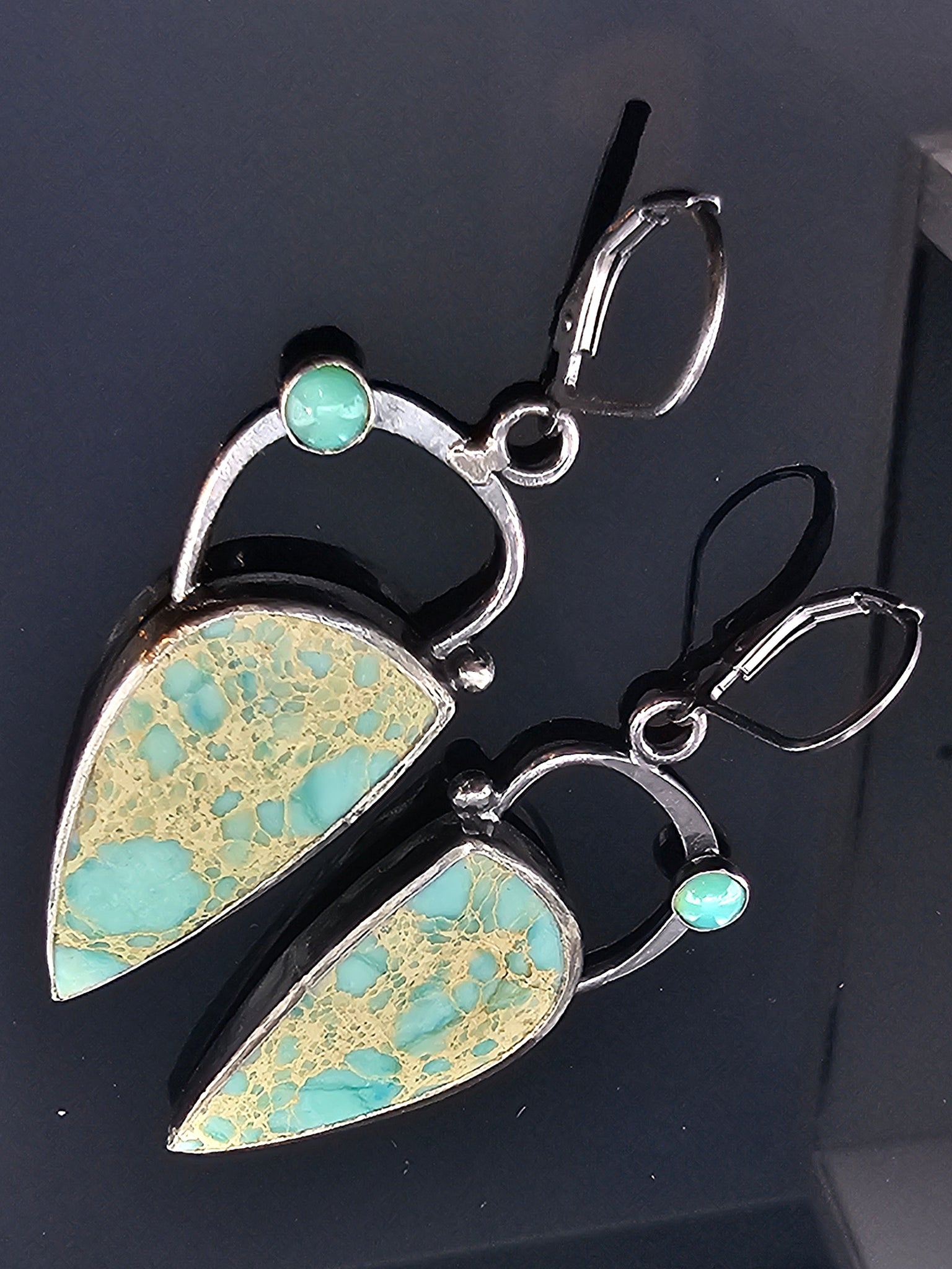 These refined earrings unite the natural elegance of Sea Sediment Jasper with a delicate chrysoprase cabochon, all set in sterling silver. The antique finish lends a timeless sophistication, while the lever back ear wires ensure both comfort and security. At approximately 1.75 inches, they strike a graceful balance between presence and subtlety. An exclusive creation by Alejandra Whittier of Stone Disegno by Ale©.