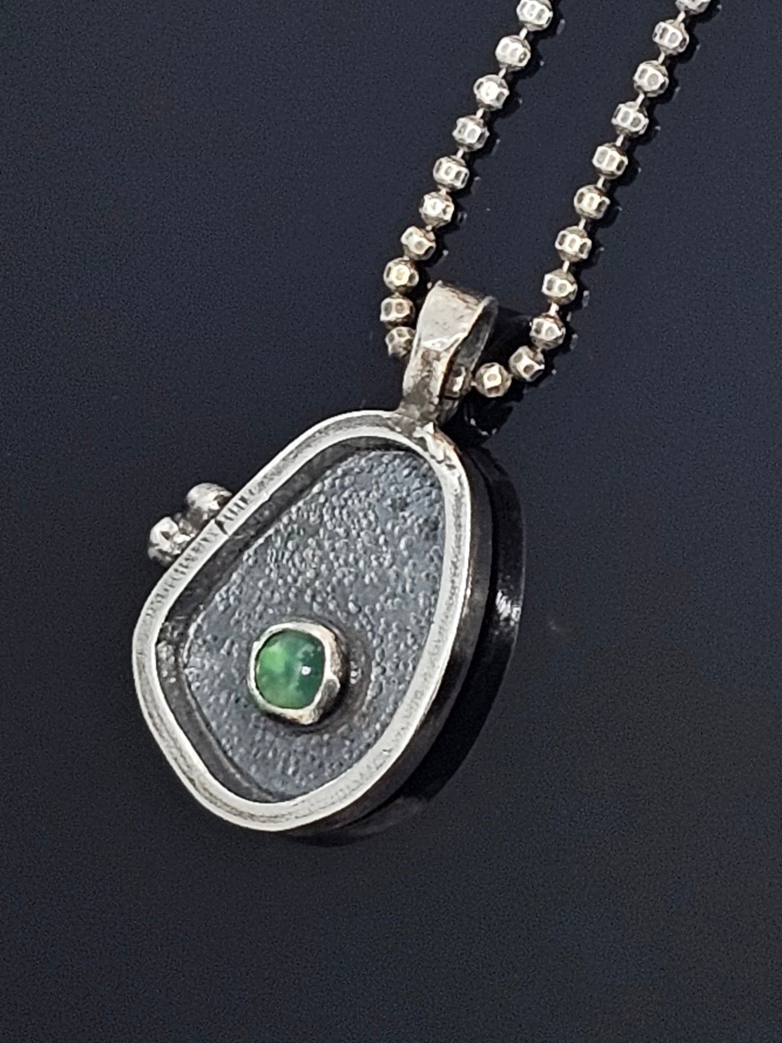 Green Onyx cab set in sterling silver frame box style pendant. Includes 16"Sterling silver chain. - Antiqued finish. Original design by Alejandra Whittier/Stone Disegno by Ale©