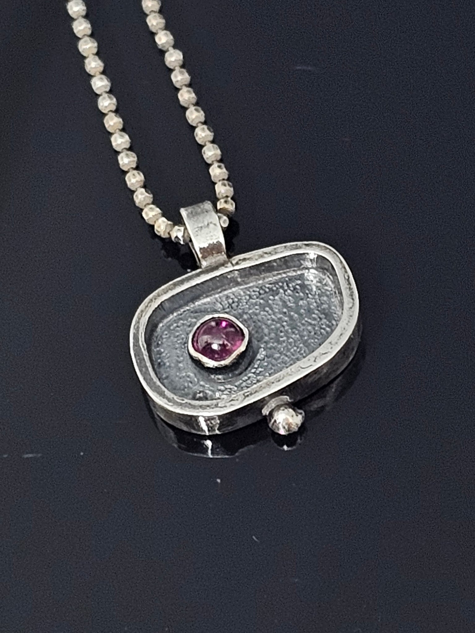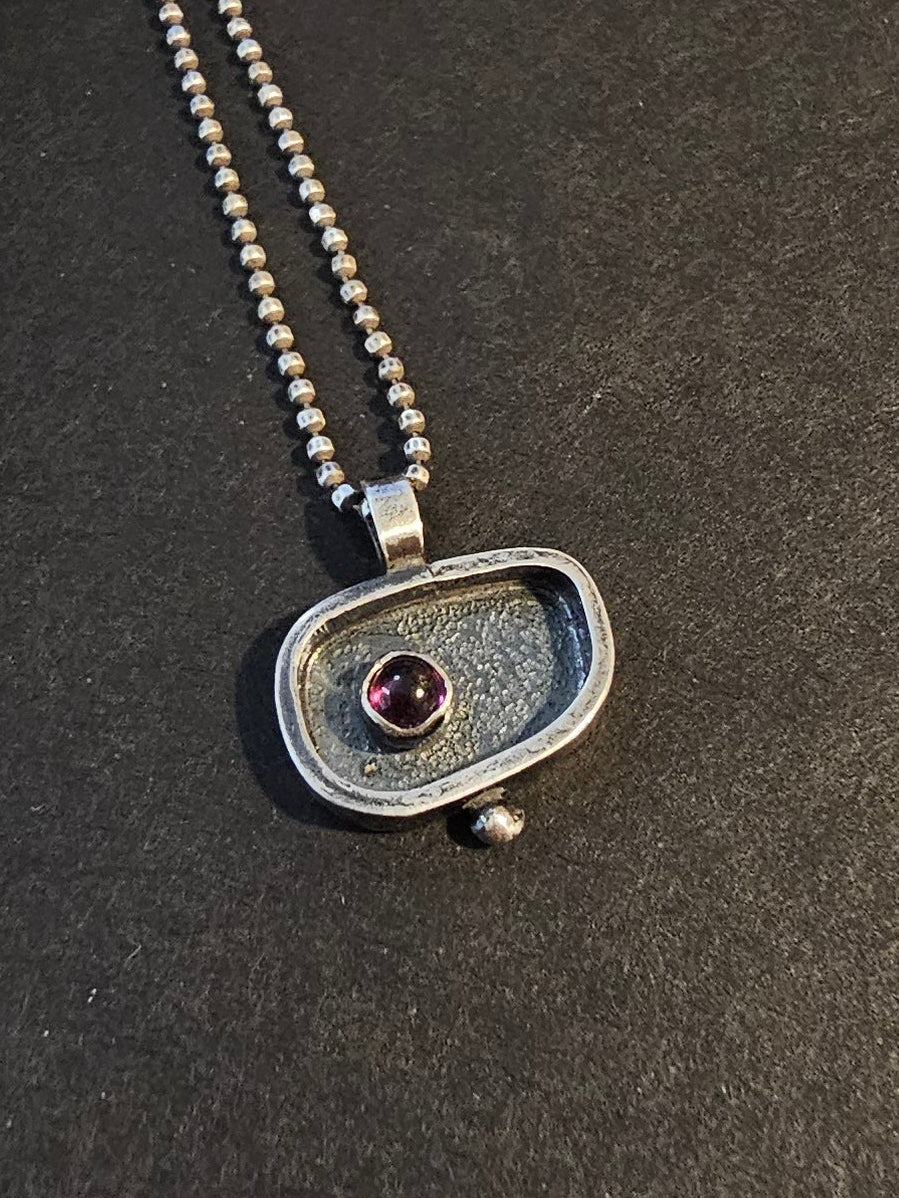 Rhodolite garnet cab set in sterling silver frame box style pendant. Includes 16"Sterling silver chain. - Antiqued finish. Original design by Alejandra Whittier/Stone Disegno by Ale©