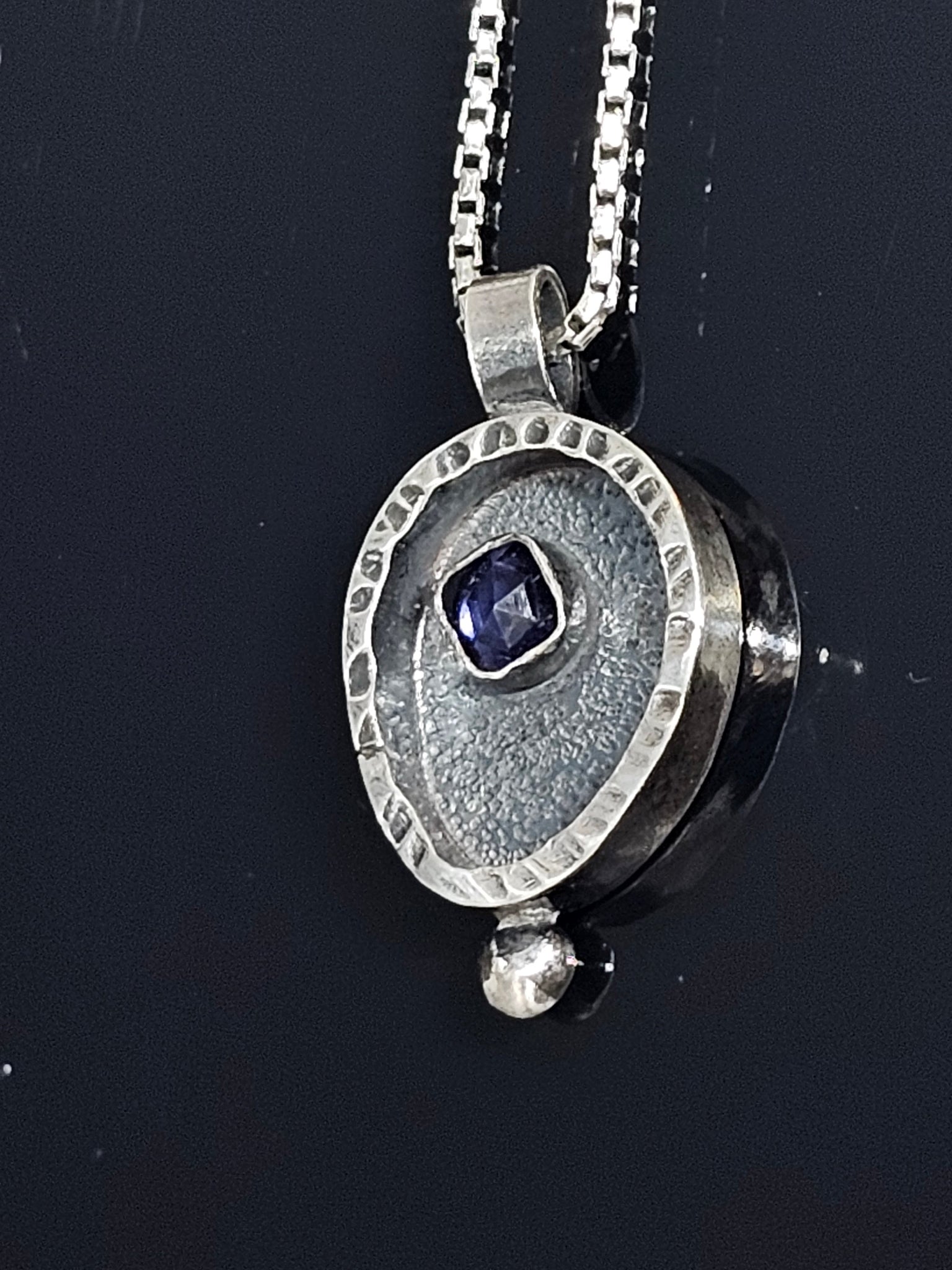 Iolite faceted cab set in sterling silver frame box style pendant. Includes 18" Sterling silver chain. - Antiqued finish. Original design by Alejandra Whittier/Stone Disegno by Ale©