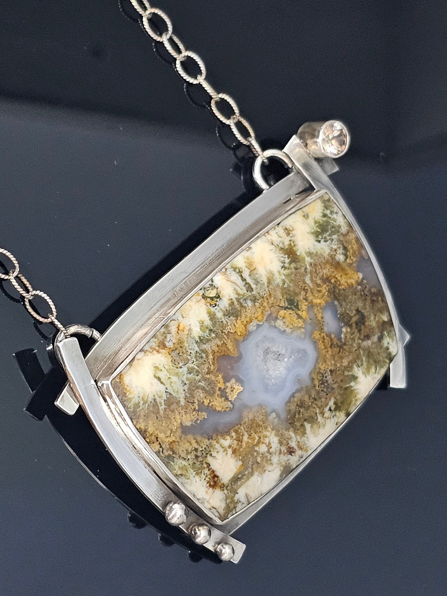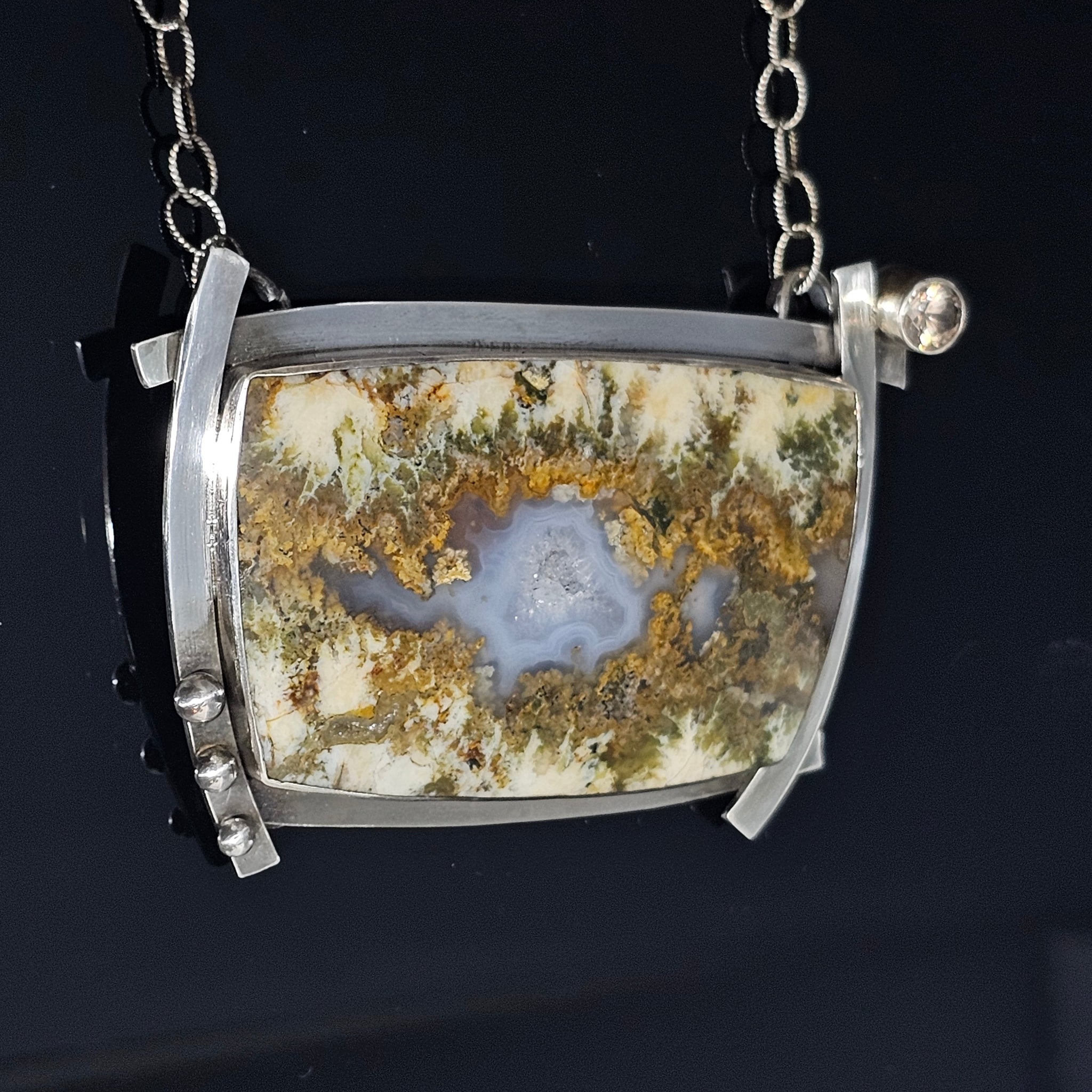 This striking pendant showcases a substantial Linda Marie Plume Agate stone, expertly mounted in artisan sterling silver and adorned with a sparkling zircon accent. The design features an antique patina that enhances its timeless appeal. Handcrafted by Stone Disegno by Ale, each piece reflects meticulous attention to detail. The pendant measures approximately 2.25" x 1.75" and arrives with a 19" adjustable sterling silver chain, offering versatile styling options for any occasion.