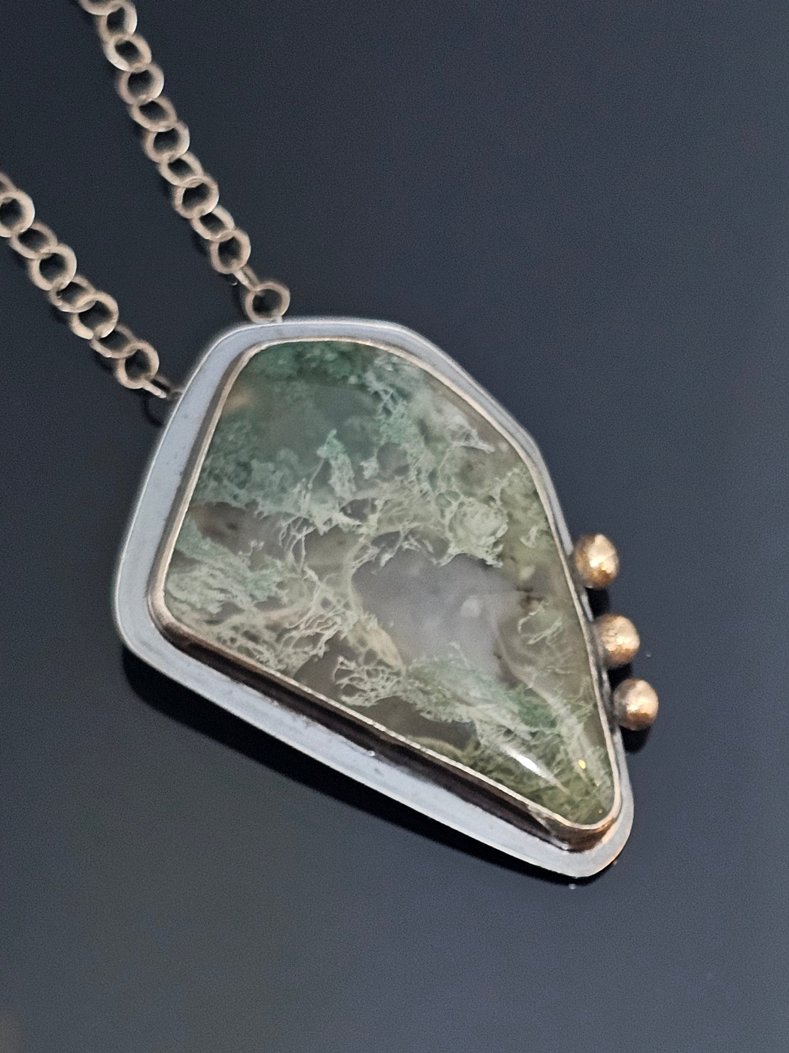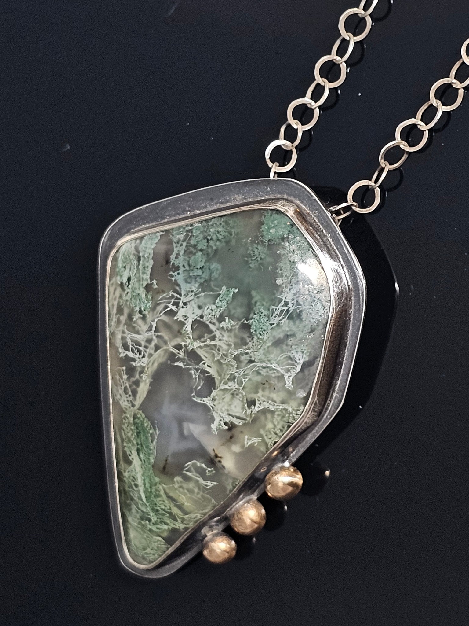 Gorgeous moss agate stone mounted in sterling silver and paired with brass pebbles accents . Antique finish. Includes 20" adjustable sterling silver chain. Original design of Alejandra Whittier/Stone Disegno by Ale©