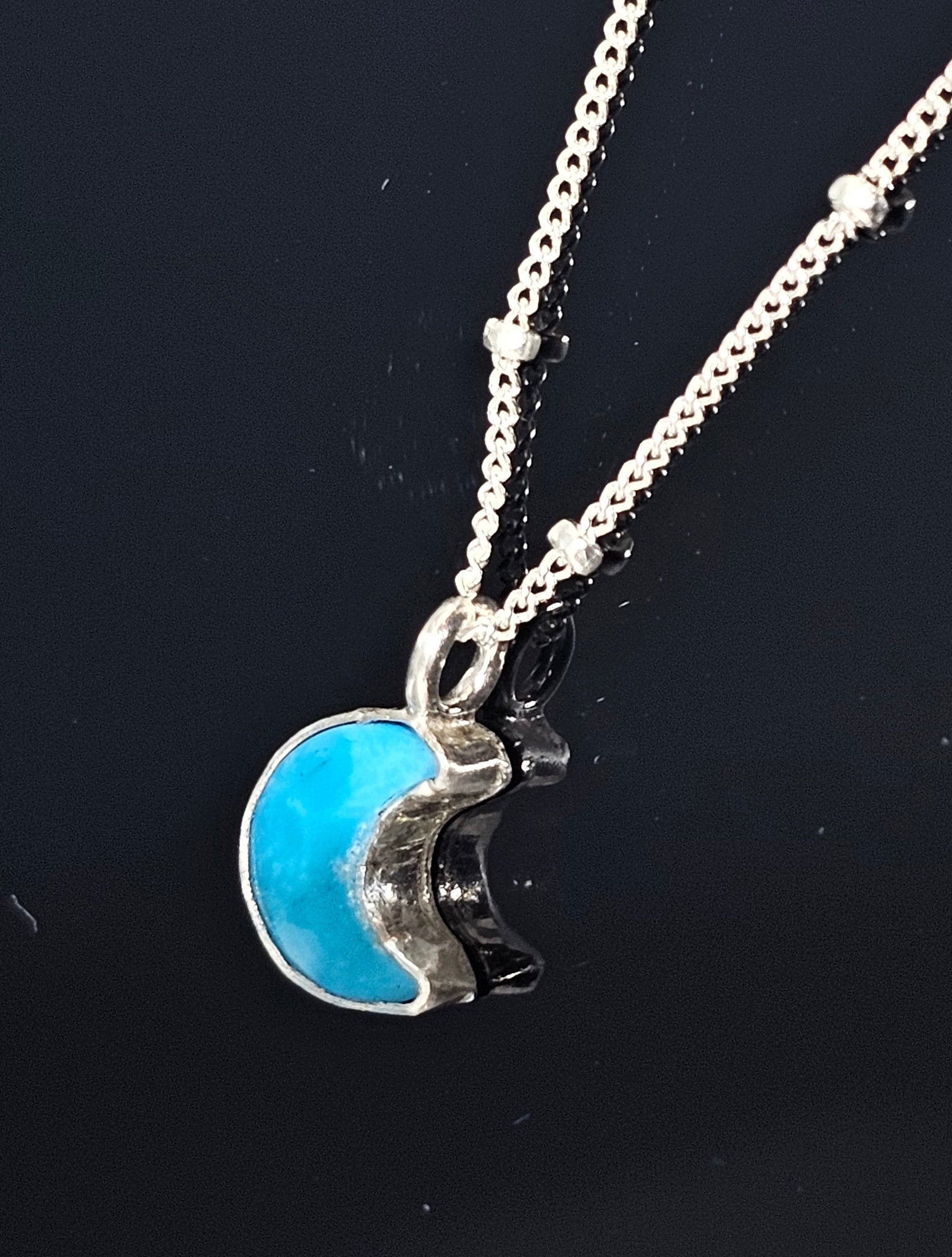 Mini turquoise moon cab set in sterling silver frame box style pendant. Includes 18" Sterling silver chain. Bright finish. Original design by Alejandra Whittier/Stone Disegno by Ale©