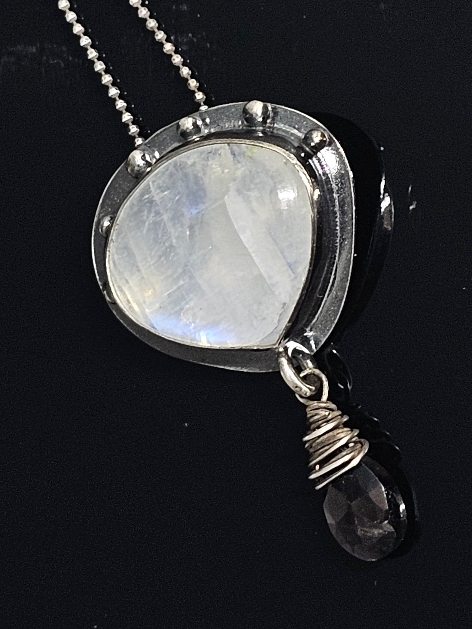 Pear shaped moonstone set in sterling silver with a sapphire stone as accent.  Includes 20" Sterling silver chain. Antique finish. Original design by Alejandra Whittier/Stone Disegno by Ale©