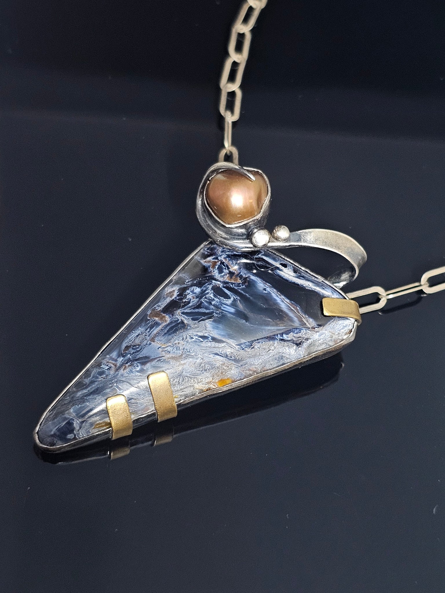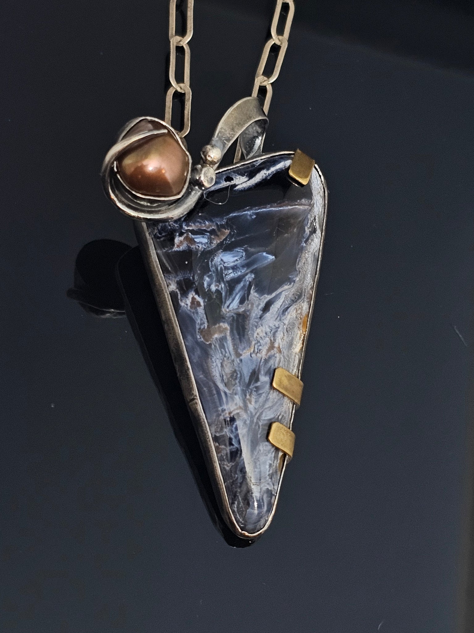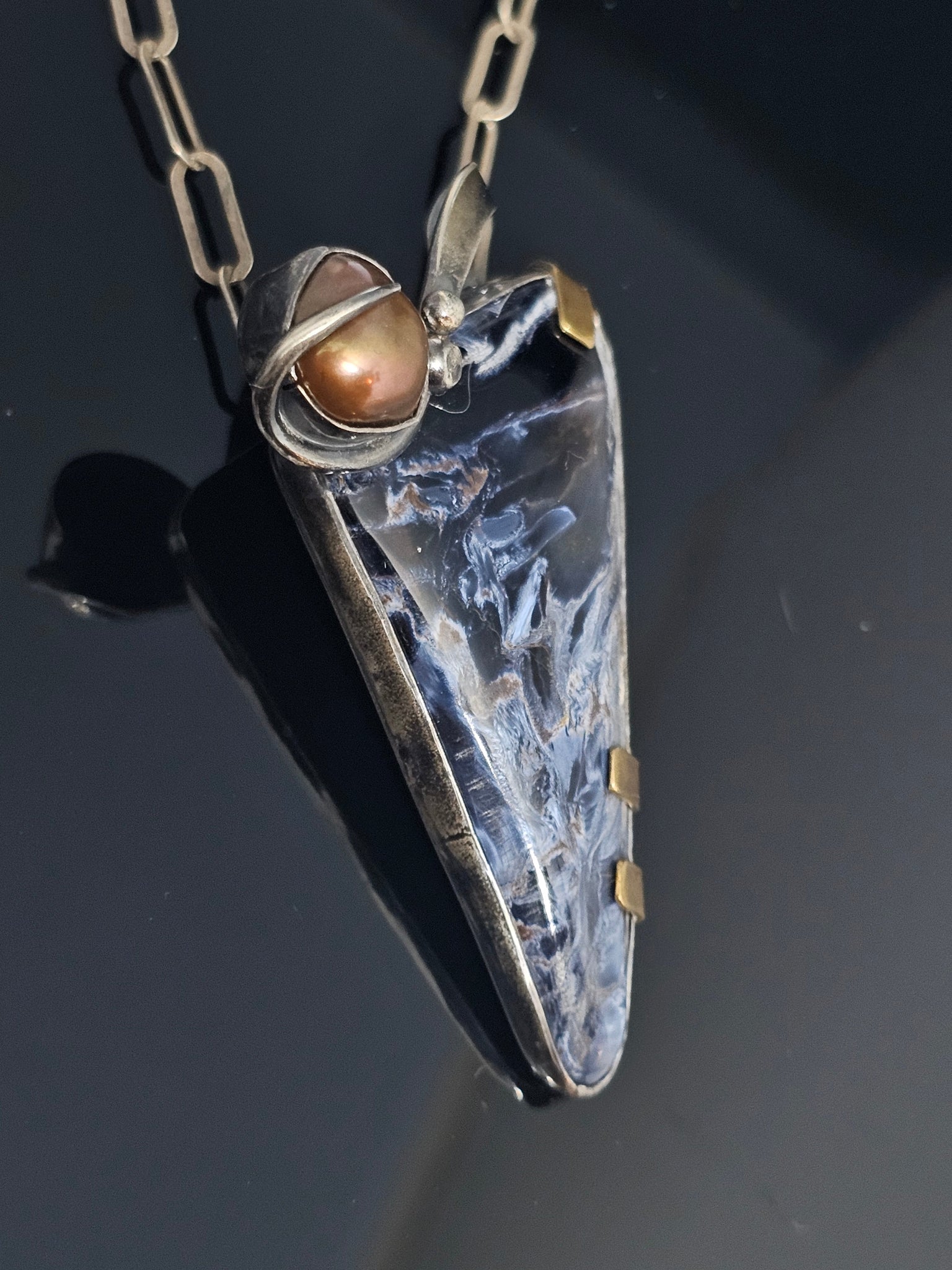 Large beautiful chatoyant pietersite stone, with blue and dark brown undertones, set in sterling silver with a chocolate fresh water pear. Includes 23" adjustable Sterling silver chain. Antique finish. Original design by Alejandra Whittier/Stone Disegno by Ale©