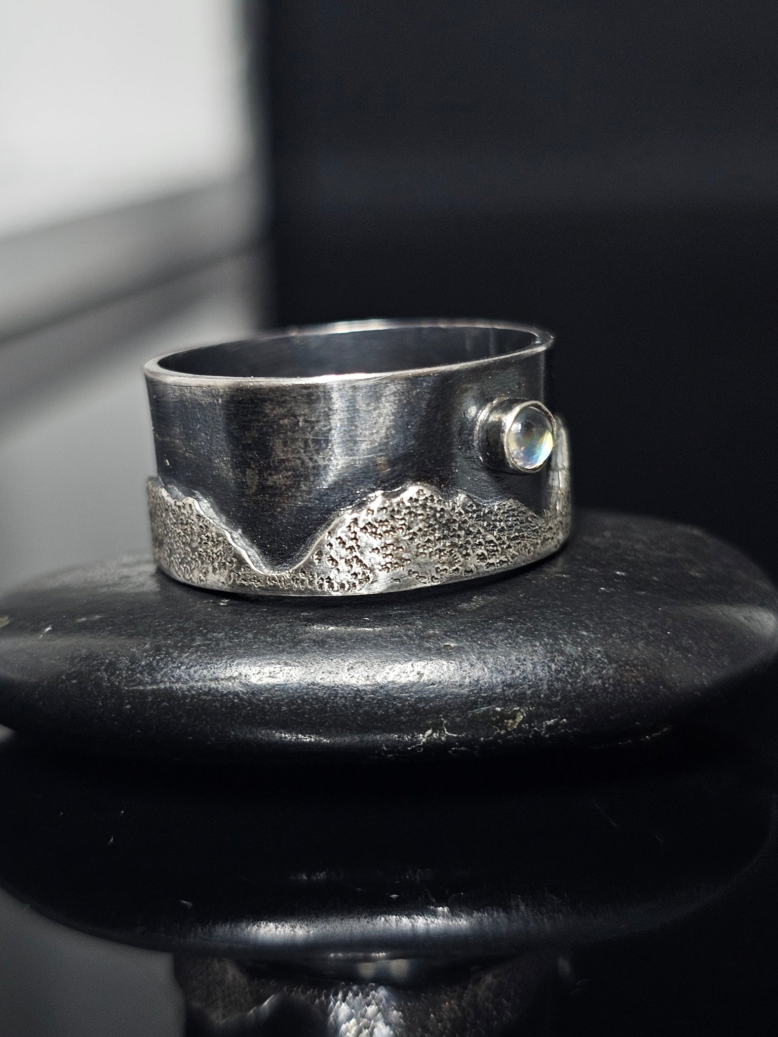 Mountain range sterling silver ring, accented with a rainbow moonstone. Fits ring size 8. Sterling band: 3/8" wide. Antique finish. Original design of Alejandra Whittier/Stone Disegno by Ale©