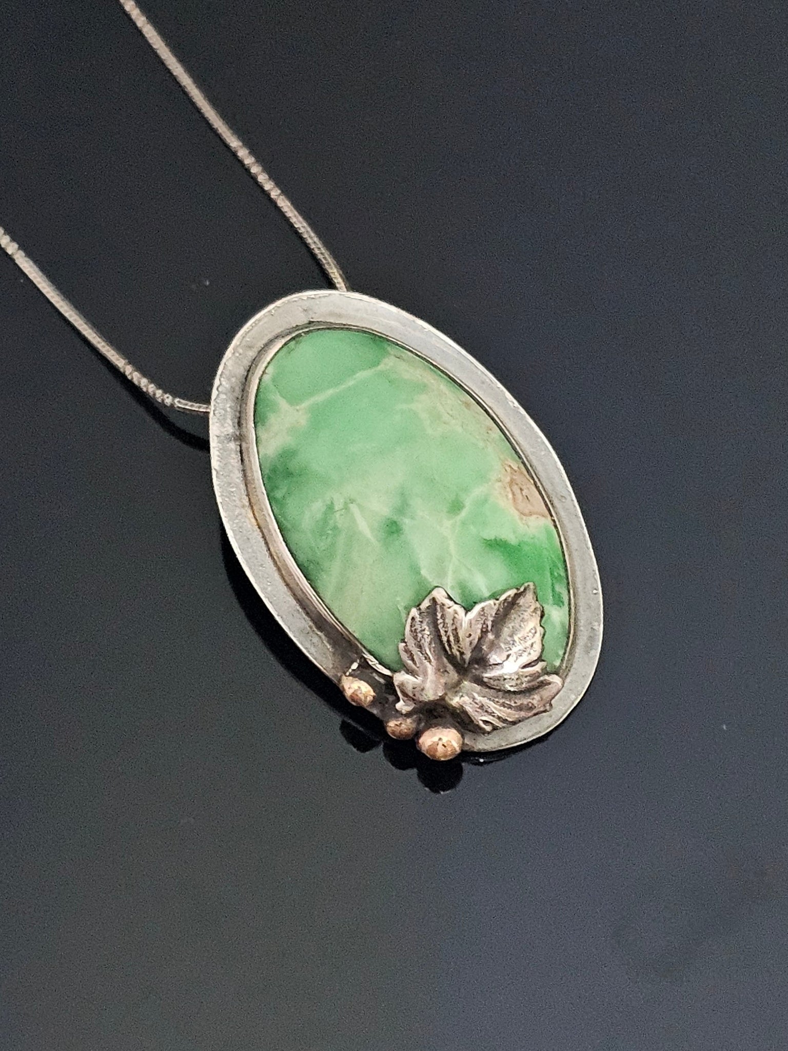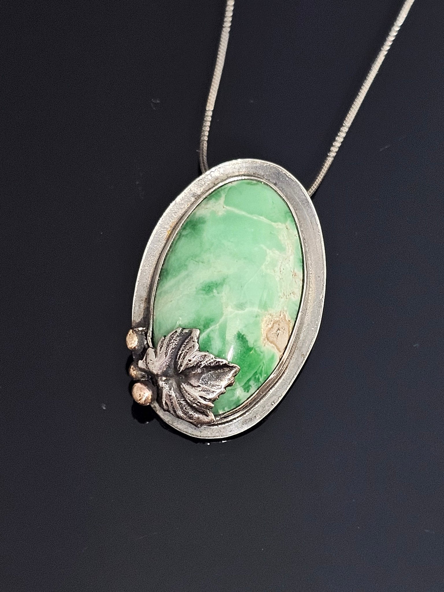 Nice variscite stone set in sterling silver and a silver oak leaf and brass accents. Includes 20" Sterling silver chain. Antique finish.